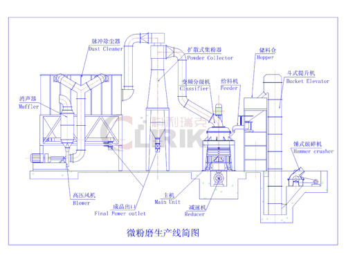 高強石膏粉磨粉機全套配置包括錘式破碎機、斗式提升機、儲料倉、震動給料機、微粉磨主機、變頻分級機、雙聯旋風集粉器、脈沖除塵系統、高壓風機、空氣壓縮機、電器控制系統。